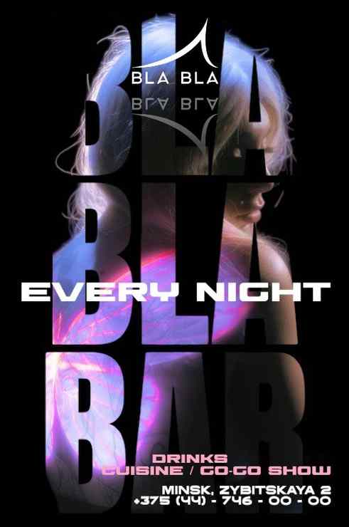 Bla Bla Bar (Бла Бла Бар) известен своими яркими go-go шоу, которые являются ключевой частью его вечерней концепции. Регулярные диджей-сеты, танцевальные программы и энергичная подача создают атмосферу настоящего городского праздника. Гостям доступны разнообразные авторские коктейли, блюда кухни, а также бестабачные безникотиновые кальяны, которые дополняют отдых и делают его более расслабленным. В тёплый сезон работает летняя терраса — уютная зона со столами, где можно провести время на свежем воздухе и насладиться атмосферой Зыбицкой. Заведение ориентировано на яркие эмоции, лёгкое настроение и насыщенный вечер.